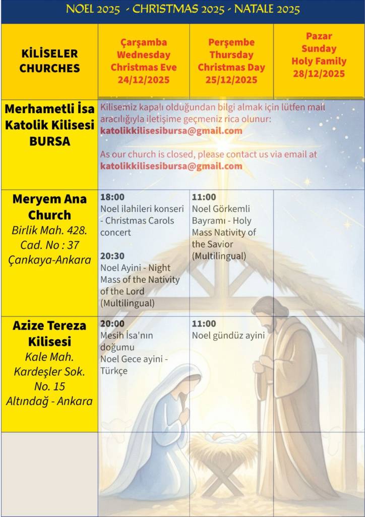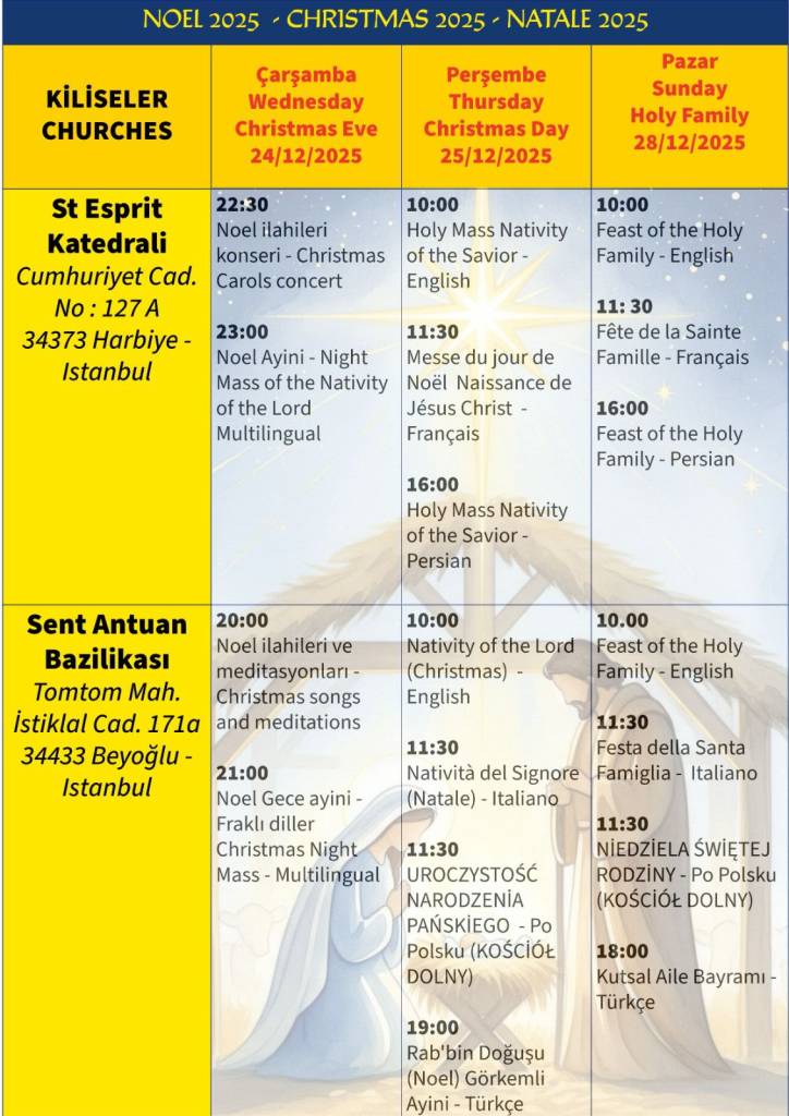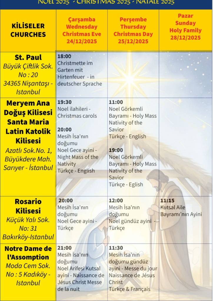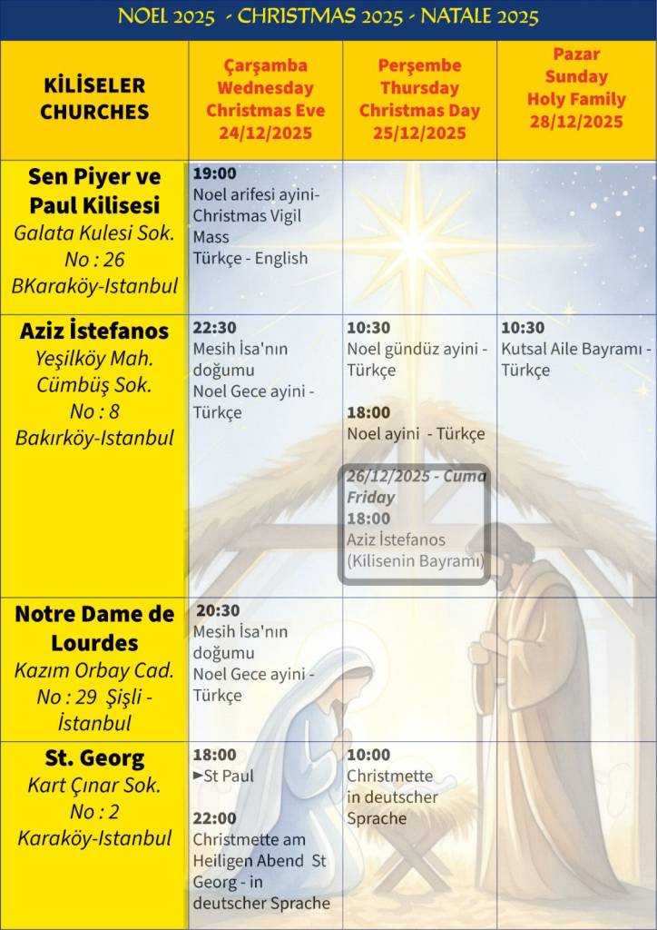 Noel Kutlamaları: 24–28 Aralık tarihleri arasında Santa Maria Draperis Latin Katolik Kilisesi’nde Noel ayinleri ve kutlamaları yapılacaktır.
